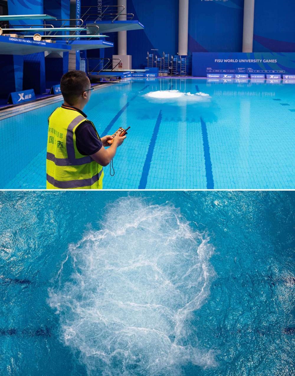 這是一張拼版照片。上圖為:7月22日,在簡(jiǎn)陽(yáng)文體中心游泳館,中國(guó)華西四川機(jī)司東來(lái)印象(簡(jiǎn)陽(yáng)文體中心)項(xiàng)目工作人員正在操作池底安全氣墊系統(tǒng)。下圖為:池底安全氣墊系統(tǒng)效果展示。該系統(tǒng)為確保跳水運(yùn)動(dòng)員安全,在氣體釋放時(shí)形成上升水流和側(cè)向水流增加水體的柔軟度和彈性,減緩人體在水中的降落速度,防止對(duì)運(yùn)動(dòng)員身體的傷害。新華社記者 江宏景 攝