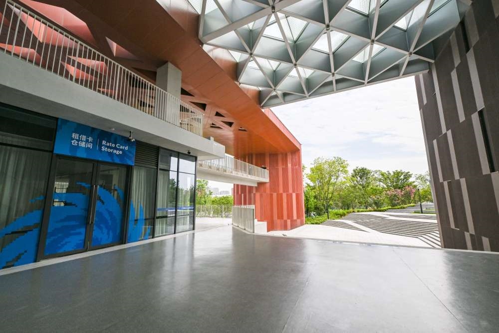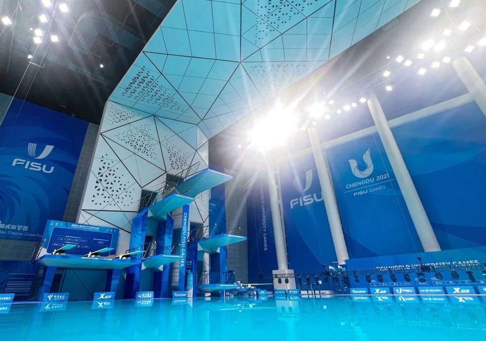 7月22日拍攝的簡(jiǎn)陽(yáng)文體中心游泳館跳水臺(tái),它是我國(guó)唯一一座多折面異型清水混凝土跳臺(tái),經(jīng)久耐用且節(jié)約資源。簡(jiǎn)陽(yáng)文體中心游泳館是成都大運(yùn)會(huì)跳水項(xiàng)目的比賽場(chǎng)館。新華社記者 江宏景 攝