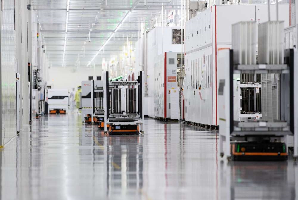 6月21日,在通威太陽(yáng)能成都雙流生產(chǎn)基地太陽(yáng)能電池片智能智造車(chē)間,機(jī)器人在穿梭轉(zhuǎn)運(yùn)。新華社記者 江宏景 攝
