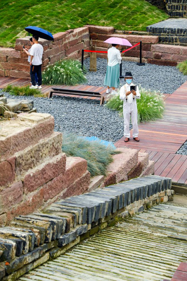 7月20日,在成都東華門遺址公園外場(chǎng)遺址區(qū),人們?cè)趨⒂^原狀展示的水道踏道遺跡。新華社記者 沈伯韓 攝