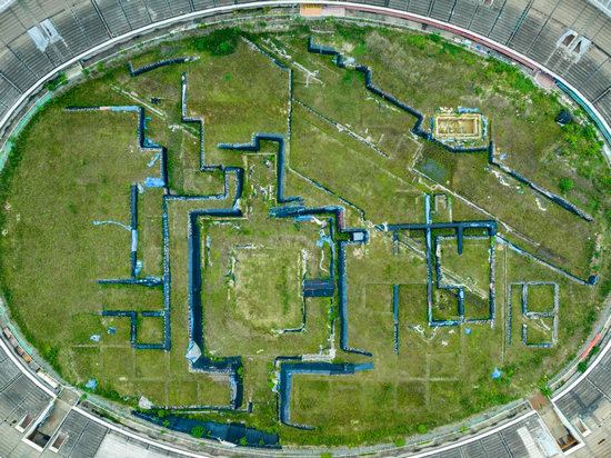 7月20日拍攝的位于成都體育中心內(nèi)的東華門遺址公園遺址區(qū)(無(wú)人機(jī)照片)。新華社記者 沈伯韓 攝