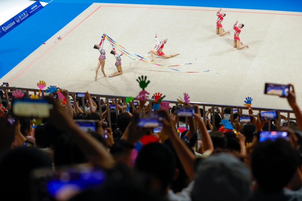 7月30日,成都大運會藝術(shù)體操項目集體全能進行決賽第二輪。新華社記者 沈伯韓 攝