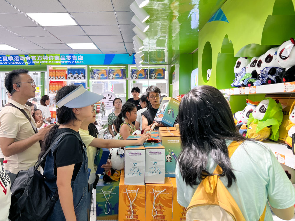 據(jù)成都大運(yùn)會(huì)官方特許商品零售店紅星路店店長(zhǎng)胡杰介紹,自6月下旬開(kāi)業(yè)以來(lái),店里便一直處于忙碌的狀態(tài)。“我們?cè)缟?點(diǎn)營(yíng)業(yè)到晚上12點(diǎn),門口經(jīng)常有約百人在排隊(duì),很多消費(fèi)者在我們開(kāi)店之前就排在門口,拿著圖片問(wèn)哪些有貨、能買到哪些。”胡杰表示,店里目前每天接待顧客約3萬(wàn)人次,日均銷售額在40-50萬(wàn)元之間。
