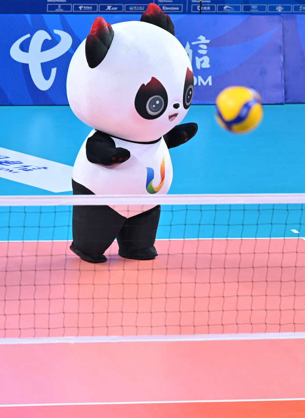 7月30日,吉祥物“蓉寶”在比賽間隙活躍氣氛。新華社記者 陳澤國(guó) 攝