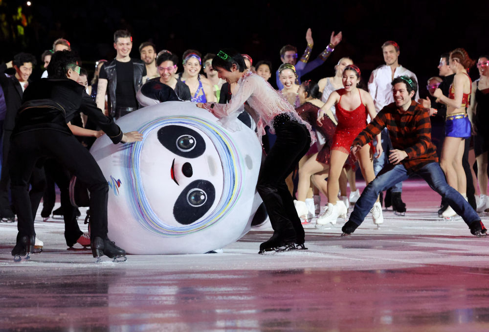 2022年2月20日,“冰墩墩”摔倒后,選手們上前幫忙。當(dāng)日,北京2022年冬奧會(huì)花樣滑冰表演滑在首都體育館舉行。新華社記者 張玉薇 攝