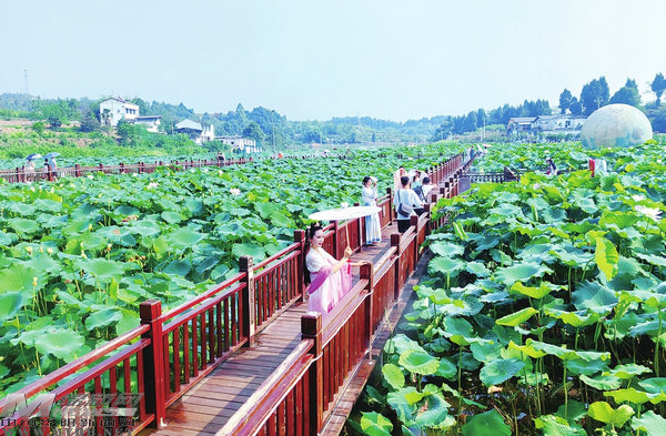 涪城區(qū)吳家鎮(zhèn)“湖光山色”稻漁親水濕地農業(yè)主題公園內荷花盛開,游人紛至沓來。
