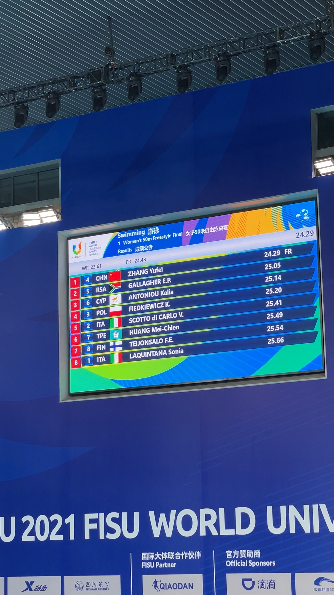 8月7日,成都大運(yùn)會(huì)女子50米自由泳項(xiàng)目決賽在東安湖體育公園游泳跳水館舉行,中國(guó)隊(duì)員張雨霏以24.29秒的成績(jī)奪得金牌,并打破世界大學(xué)生運(yùn)動(dòng)會(huì)該項(xiàng)目的紀(jì)錄,這也是張雨霏在本屆大運(yùn)會(huì)的第8金。