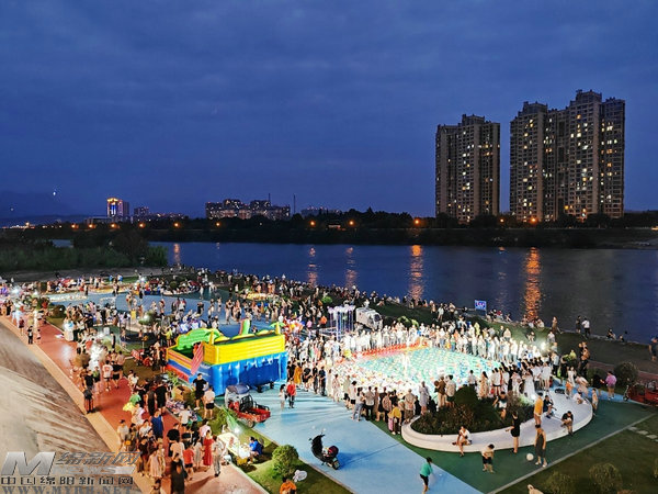 在江油金外灘跨涪江人行橋廣場(chǎng)上,一到夜晚,非常熱鬧。到處閃耀著流光溢彩的燈光、香氣撲鼻的美食、趣味十足的互動(dòng)游戲、地?cái)偵狭宅槤M(mǎn)目的小商品,吸引著成群結(jié)隊(duì)的市民到此納涼、休閑,蹦迪人群更是掀起一浪接一浪的狂潮。市民楊霞說(shuō):“自從今年7月‘網(wǎng)紅橋’開(kāi)通后,每天晚上這里的人氣都非常旺,小攤小販很多,商品琳瑯滿(mǎn)目,每天晚上都要來(lái)轉(zhuǎn)一轉(zhuǎn)、看一看……”