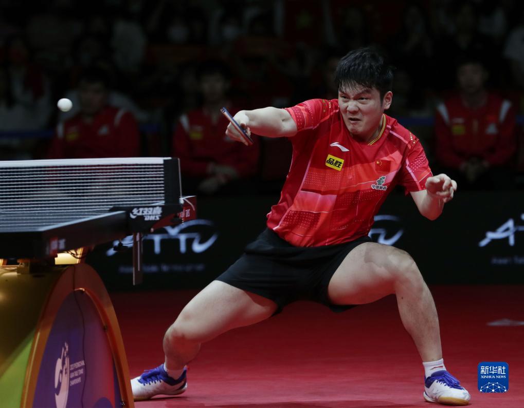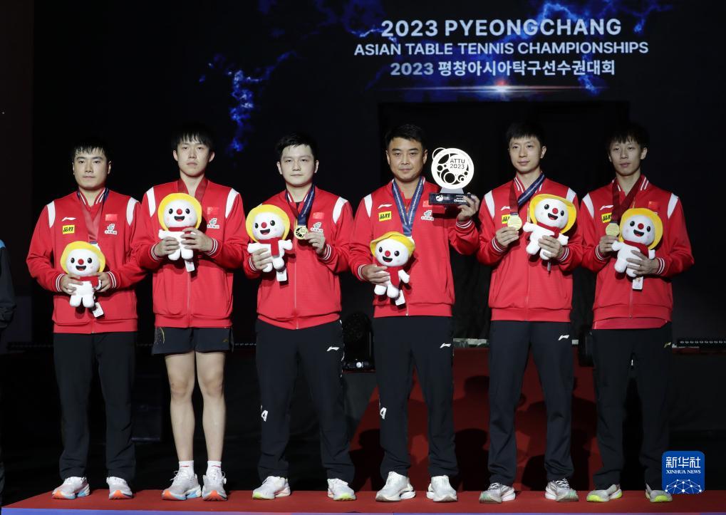 當日,2023年乒乓球亞錦賽男子團體賽決賽在韓國平昌舉行。中國隊以3比0戰(zhàn)勝中國臺北隊,奪得冠軍。