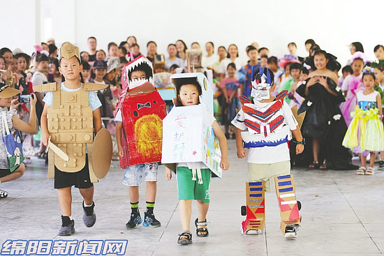 綿陽新聞網(wǎng)訊 近日,一場“環(huán)保時裝秀”在綿陽市南街小學(xué)習(xí)藝坊拉開帷幕,百余名學(xué)生在老師和家長的協(xié)助下,發(fā)揮想象,用靈巧的雙手對塑料袋、紙殼、舊報紙、舊衣物等廢舊物品進行分類設(shè)計,改造成一件件獨具匠心的“時裝”,走出了一場別開生面的時尚大秀(如圖)。
