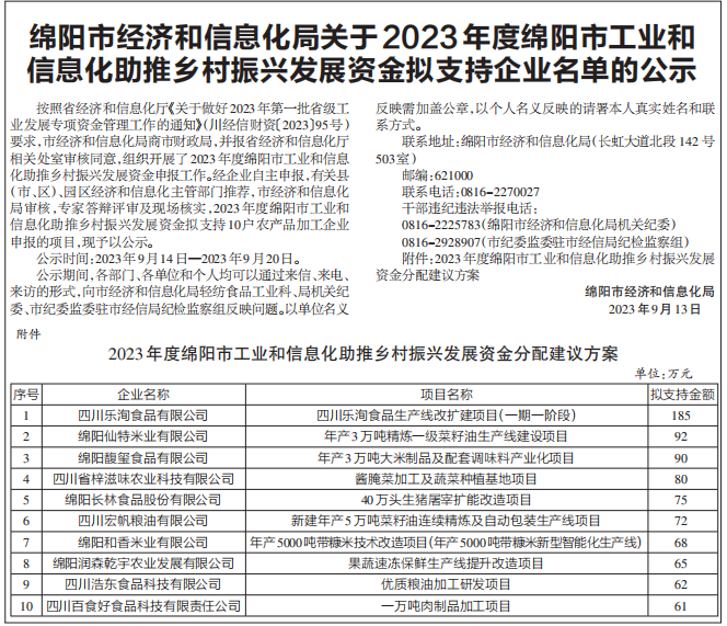綿陽市經濟和信息化局關于2023年度綿陽市工業(yè)和信息化助推鄉(xiāng)村振興發(fā)展資金擬支持企業(yè)名單的公示