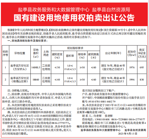 鹽亭縣政務(wù)服務(wù)和大數(shù)據(jù)管理中心 鹽亭縣自然資源局國(guó)有建設(shè)用地使用權(quán)拍賣出讓公告