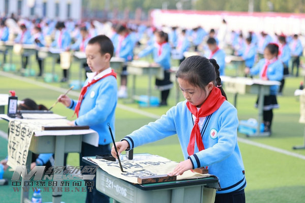 臺(tái)上,四川省書法家協(xié)會(huì)副主席、市書法家協(xié)會(huì)主席龔小臏聲情并茂地講述怎樣學(xué)習(xí)書法,絲絲入扣,娓娓道來(lái),臺(tái)下,上千名小學(xué)生在操場(chǎng)整齊排列的小課桌上鋪紙擺墨,摩拳擦掌,躍躍欲試……