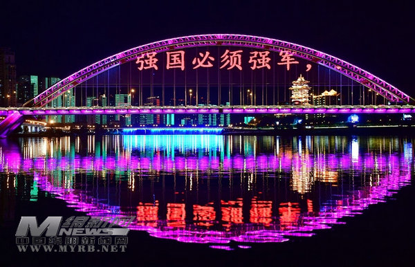 關心國防、民無兵不安、強國必須強軍……9月21日,記者在綿陽三江湖國家級濕地公園看到,一組組國防教育內容的大型字幕在富樂大橋的顯示屏上循環(huán)播放,倡導市民學習國防知識和兵役知識,接受愛國主義和國防教育,在三江兩岸璀璨的燈光中,顯得更加耀眼奪目。