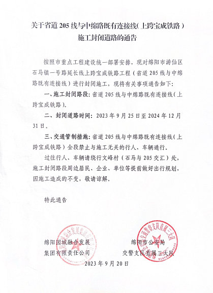 關(guān)于省道205線與中綿路既有連接線(上跨寶成鐵路)施工封閉道路的通告