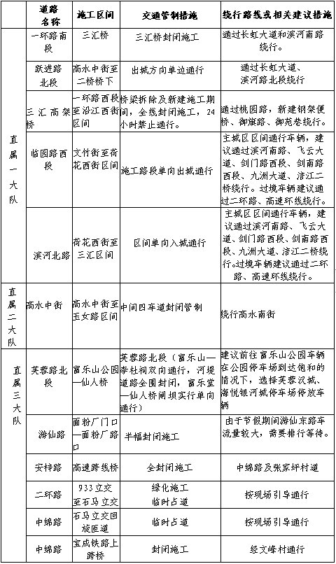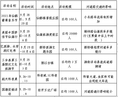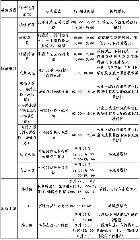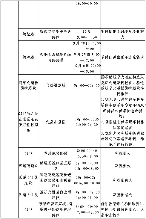 預(yù)計群眾自駕出行數(shù)量將增加,市內(nèi)以“鄉(xiāng)村游”“近郊游”“親子游”為主,綿梓路、綿興路、綿三路交通流量整體較大。