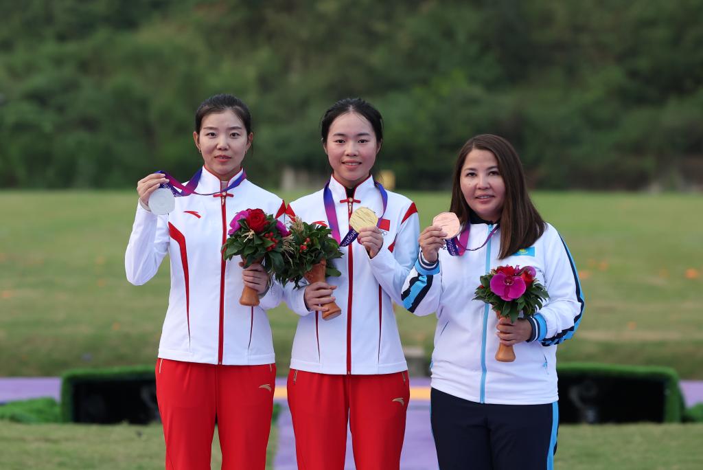 9月27日,冠軍中國(guó)選手江伊婷(中)、亞軍中國(guó)選手高金梅(左)和季軍哈薩克斯坦選手阿謝姆·奧倫拜在頒獎(jiǎng)儀式上。新華社記者 杜瀟逸 攝