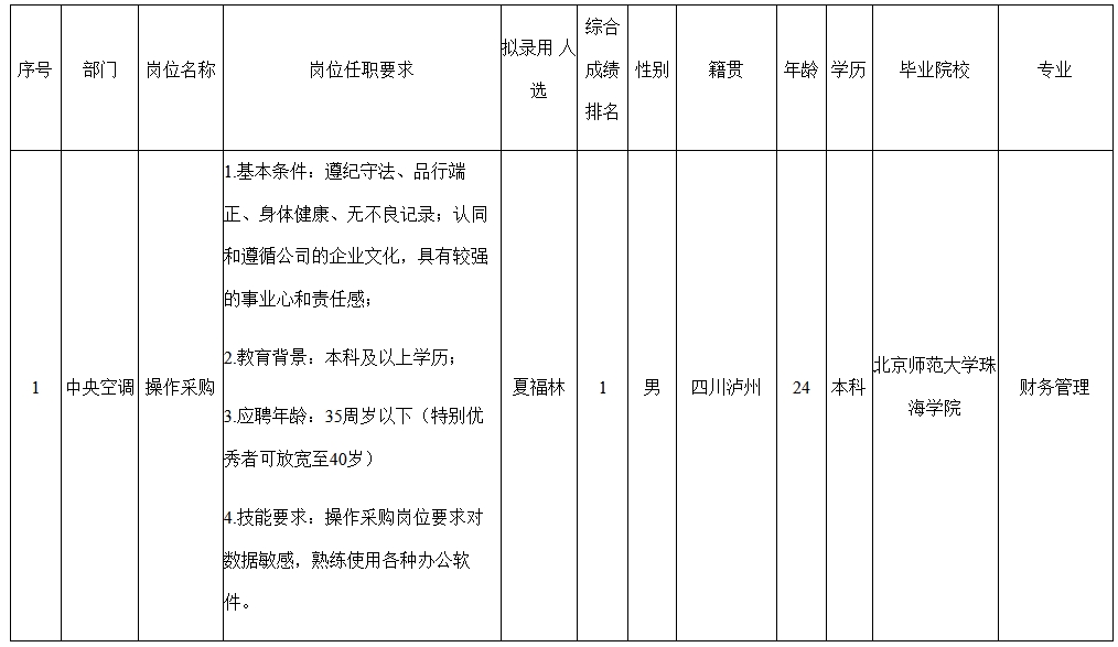 根據(jù)四川長虹空調(diào)有限公司發(fā)布的招聘公告及招聘相關(guān)規(guī)定,經(jīng)面試、考察、體檢等程序,擬錄用夏福林到長虹空調(diào)工作,現(xiàn)予以公示,具體情況如下: