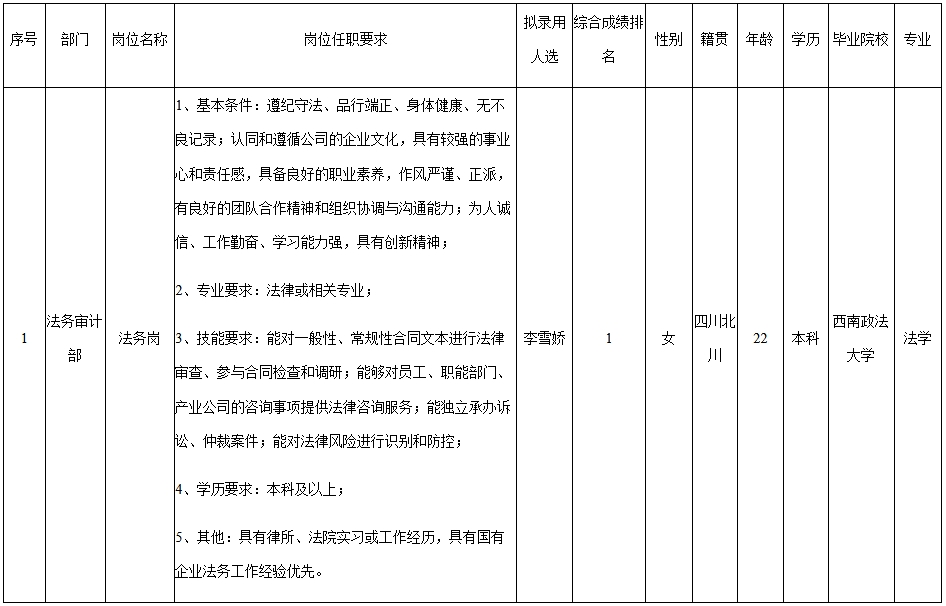 根據(jù)四川九洲投資控股集團有限公司發(fā)布的招聘公告及招聘相關規(guī)定,經(jīng)筆試、面試、考察、體檢等程序,擬錄用李雪嬌同志到四川九洲投資控股集團有限公司工作,現(xiàn)予以公示,具體情況如下: