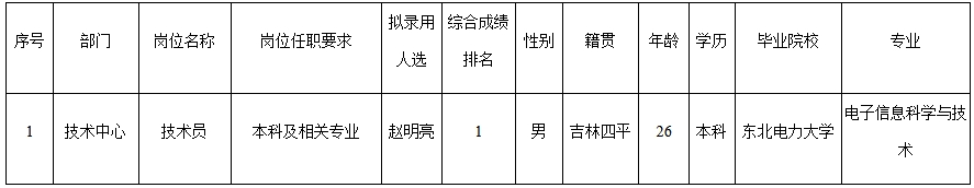 根據(jù)零八一電子集團四川天源機械有限公司發(fā)布的招聘公告及招聘相關(guān)規(guī)定,經(jīng)筆試、面試、考察、體檢等程序,擬錄用趙明亮同志到天源公司工作,現(xiàn)予以公示,具體情況如下: