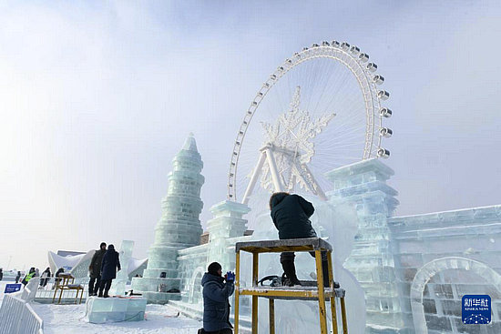 當(dāng)日,在哈爾濱冰雪大世界進(jìn)行的第35屆中國·哈爾濱國際冰雕比賽進(jìn)入第二天的賽程,來自世界各地的30余支參賽隊(duì)伍精心雕琢,盡顯哈爾濱冬季極寒之美。