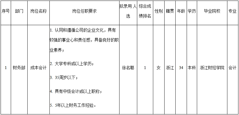 根據(jù)浙江長虹飛獅電器工業(yè)有限公司發(fā)布的招聘公告及招聘相關(guān)規(guī)定,經(jīng)筆試、面試、考察、體檢等程序,擬錄用徐名聰同志到浙江長虹飛獅電器工業(yè)有限公司工作,現(xiàn)予以公示,具體情況如下: