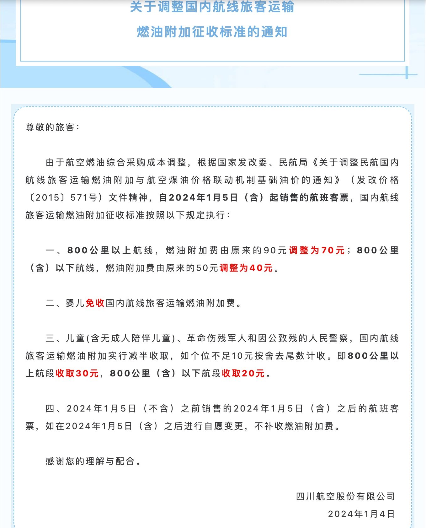 1月4日,川航發(fā)出通知稱,由于航空燃油綜合采購成本調(diào)整,根據(jù)國家發(fā)改委、民航局關(guān)于民航國內(nèi)航線旅客運輸燃油附加與航空煤油價格聯(lián)動機制相關(guān)要求,自2024年1月5日及以后銷售的航班客票,調(diào)整國內(nèi)航線燃油附加征收標(biāo)準。