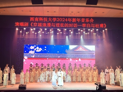 作為校地共建“中華優(yōu)秀傳統(tǒng)文化傳承基地”項目、省級扶持項目清唱劇《穿越浪漫與現(xiàn)實的對話——李白與杜甫》,由西南科技大學(xué)文學(xué)與藝術(shù)學(xué)院、綿陽市文化館合力打造。以李白、杜甫二人的多次交會和人生中幾次重要轉(zhuǎn)折點為線索,以藝術(shù)的形式呈現(xiàn)二人的風(fēng)雨人生和思索及他們心系天下與國家的赤誠情懷,啟發(fā)今人只要秉持崇高的人生理想,堅定心系民族與國家的蓬勃信念,深深融入到為人民、為國家、為民族而奮斗的火熱事業(yè)中,人生就能綻放出無限光彩。