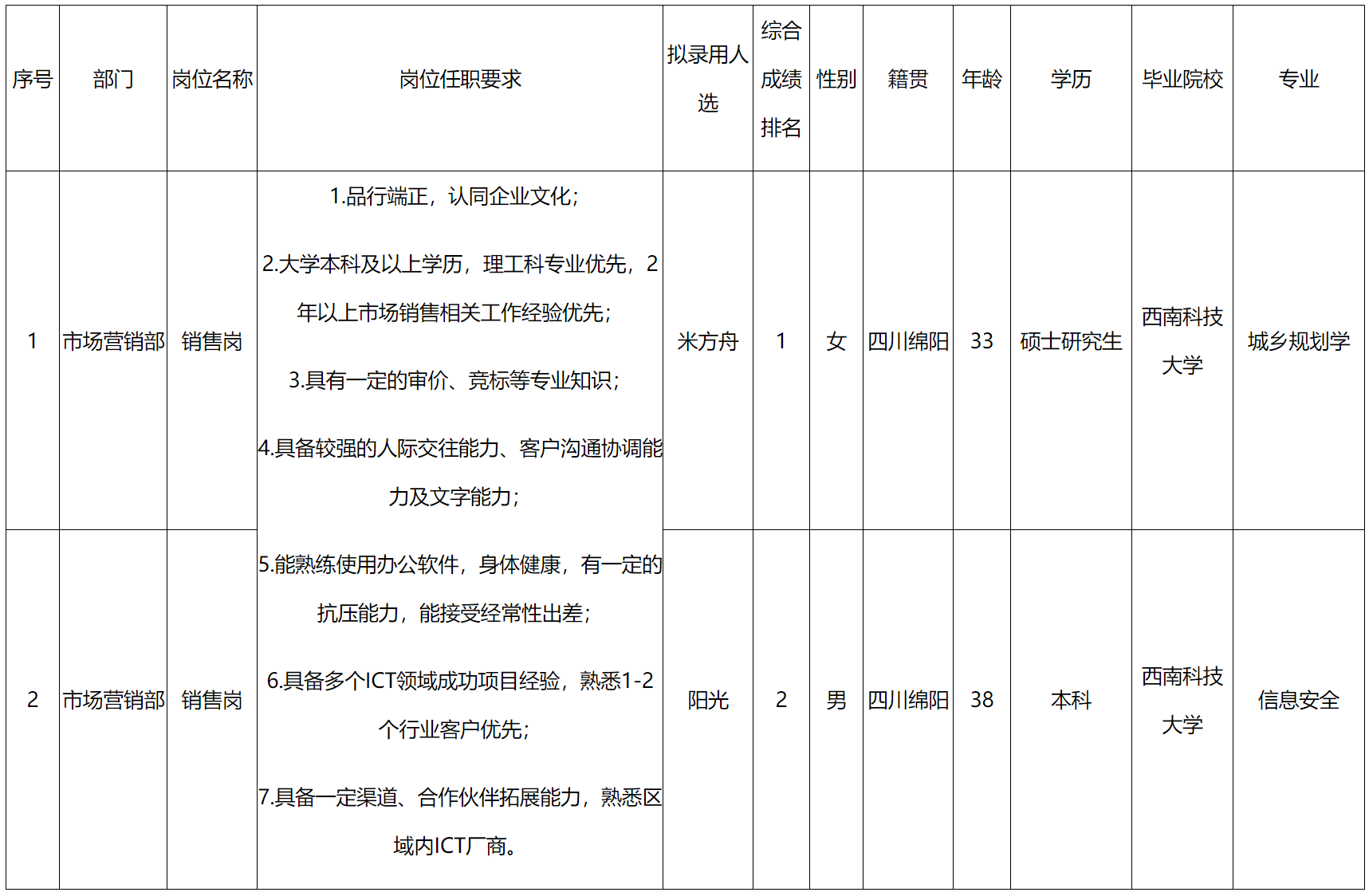 根據(jù)綿陽市智慧城市產(chǎn)業(yè)發(fā)展有限責(zé)任公司發(fā)布的招聘公告及招聘相關(guān)規(guī)定,經(jīng)筆試、面試、考察、體檢等程序,擬錄用米方舟、陽光同志到綿陽市智慧城市產(chǎn)業(yè)發(fā)展有限責(zé)任公司工作,現(xiàn)予以公示,具體情況如下: