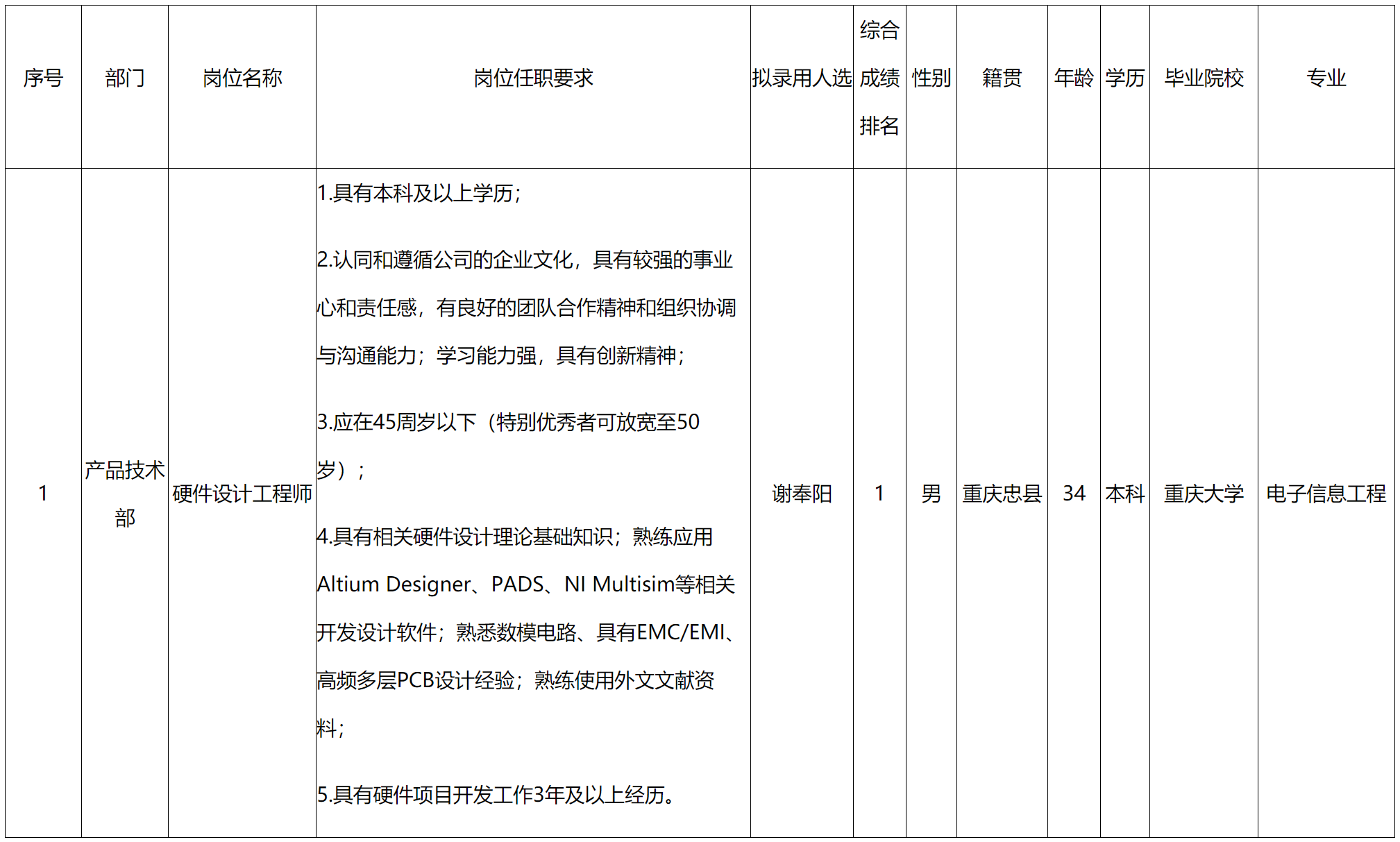 重慶九洲隆瓴科技有限公司關(guān)于招聘硬件設(shè)計工程師崗擬錄用人員的公示