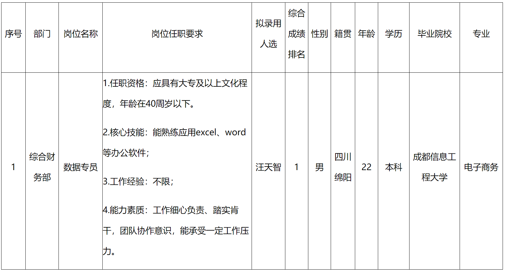根據(jù)江蘇格潤(rùn)新材料有限公司發(fā)布的招聘公告及招聘相關(guān)規(guī)定,經(jīng)面試、考察、體檢等程序,擬錄用汪天智同志到江蘇格潤(rùn)工作,現(xiàn)予以公示,具體情況如下: