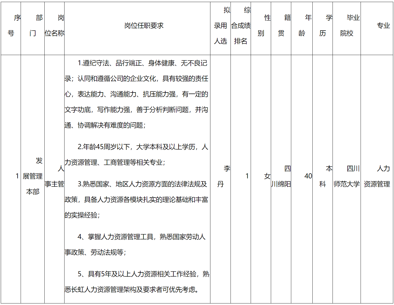 根據(jù)四川長虹新能源科技股份有限公司發(fā)布的招聘公告及招聘相關(guān)規(guī)定,經(jīng)面試、考察、體檢等程序,擬錄用李丹同志到四川長虹新能源科技股份有限公司工作,現(xiàn)予以公示,具體情況如下: