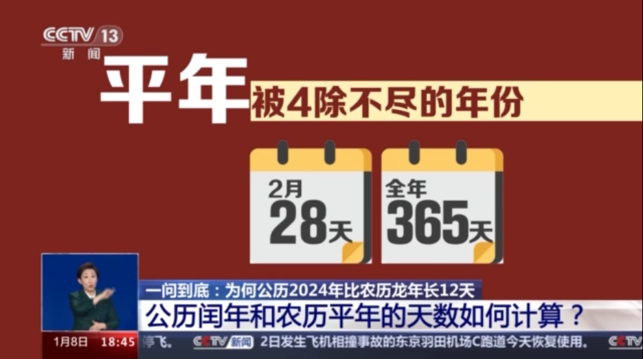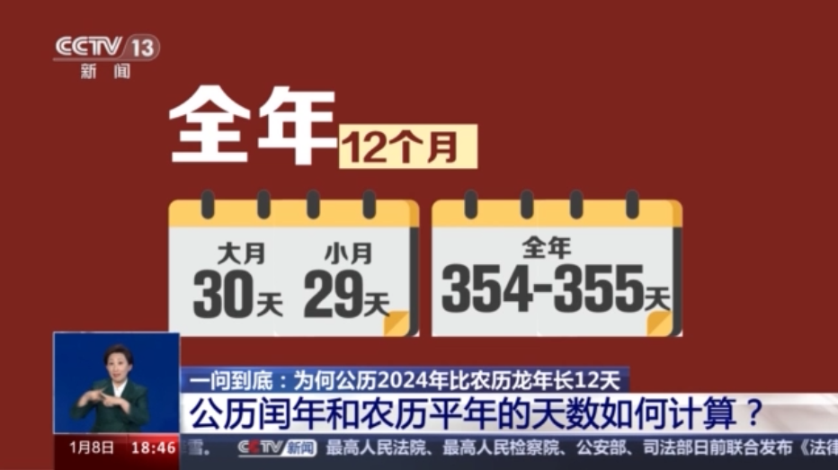 中國科學(xué)院紫金山天文臺(tái)發(fā)布的日歷資料顯示,公歷2024年為閏年,2月有29天,全年共有366天,而即將到來的農(nóng)歷甲辰年(龍年)則是平年,全年共有354天。為什么公歷2024年比農(nóng)歷龍年多出了12天?