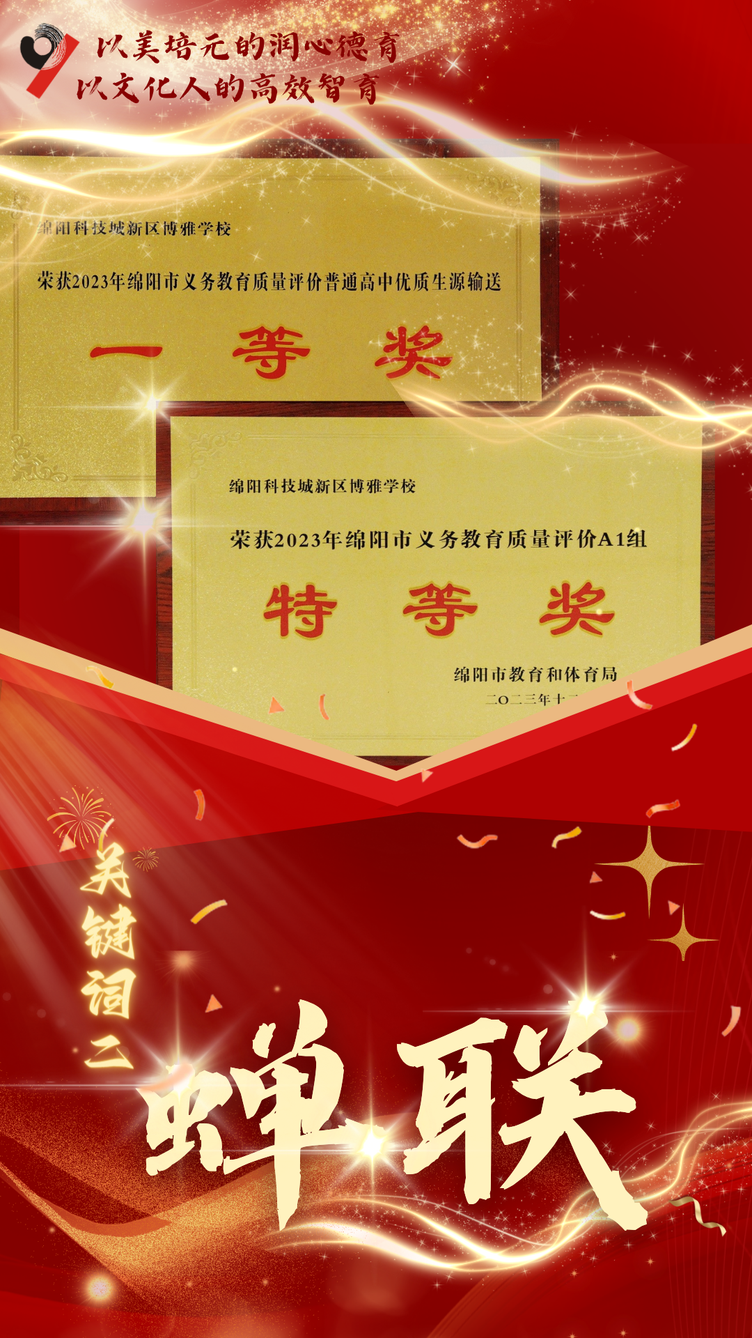 博雅學(xué)校榮獲綿陽市2023年義務(wù)教育質(zhì)量評(píng)價(jià)最高獎(jiǎng)---A1組“特等獎(jiǎng)”,建校12年連續(xù)8年榮獲此獎(jiǎng),教育質(zhì)量數(shù)據(jù)分析穩(wěn)居全區(qū)第一。