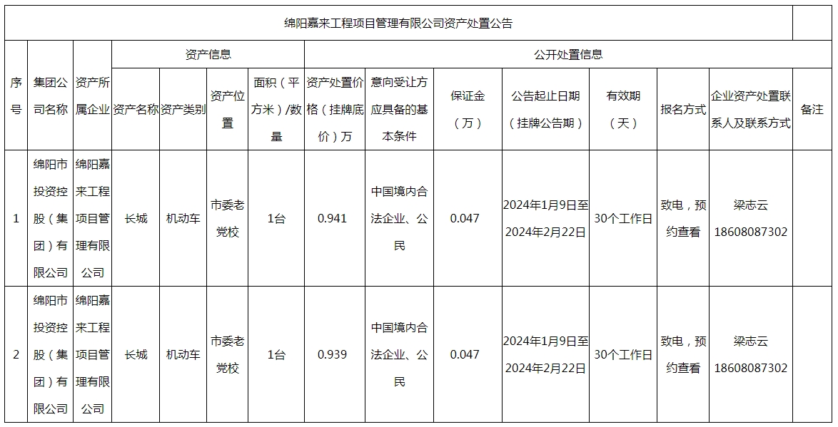 綿陽嘉來工程項目管理有限公司資產(chǎn)處置公告