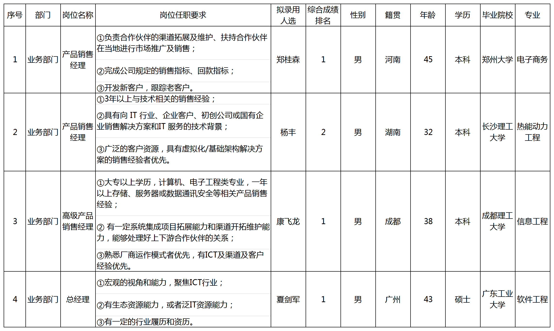 根據(jù)四川長虹佳華信息產(chǎn)品有限責(zé)任公司發(fā)布的招聘公告及招聘相關(guān)規(guī)定,經(jīng)筆試、面試、考察、體檢等程序,擬錄用鄭桂森、楊豐、康飛龍、夏劍軍同志到四川長虹佳華信息產(chǎn)品有限責(zé)任公司工作,現(xiàn)予以公示,具體情況如下: