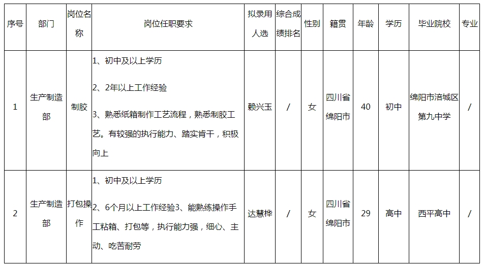 根據(jù)四川長虹包裝印務(wù)有限公司發(fā)布的招聘公告及招聘相關(guān)規(guī)定,經(jīng)筆試、面試、考察、體檢等程序,擬錄用員工2名,現(xiàn)予以公示,具體情況如下: