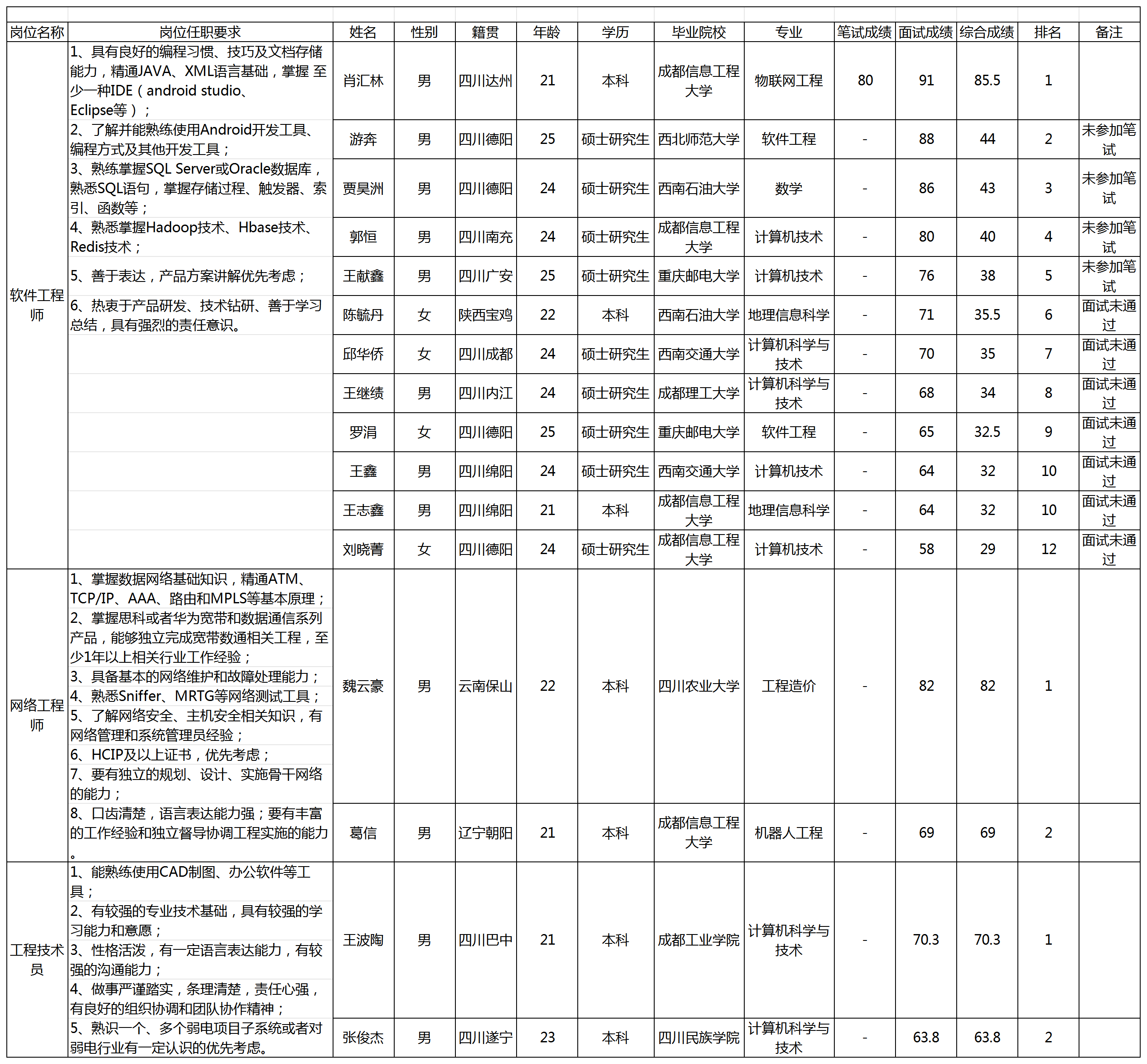根據(jù)四川九洲視訊科技有限責任公司發(fā)布的招聘公告及招聘相關(guān)規(guī)定,經(jīng)筆試、面試等程序,現(xiàn)將筆試(面試)成績予以公示。