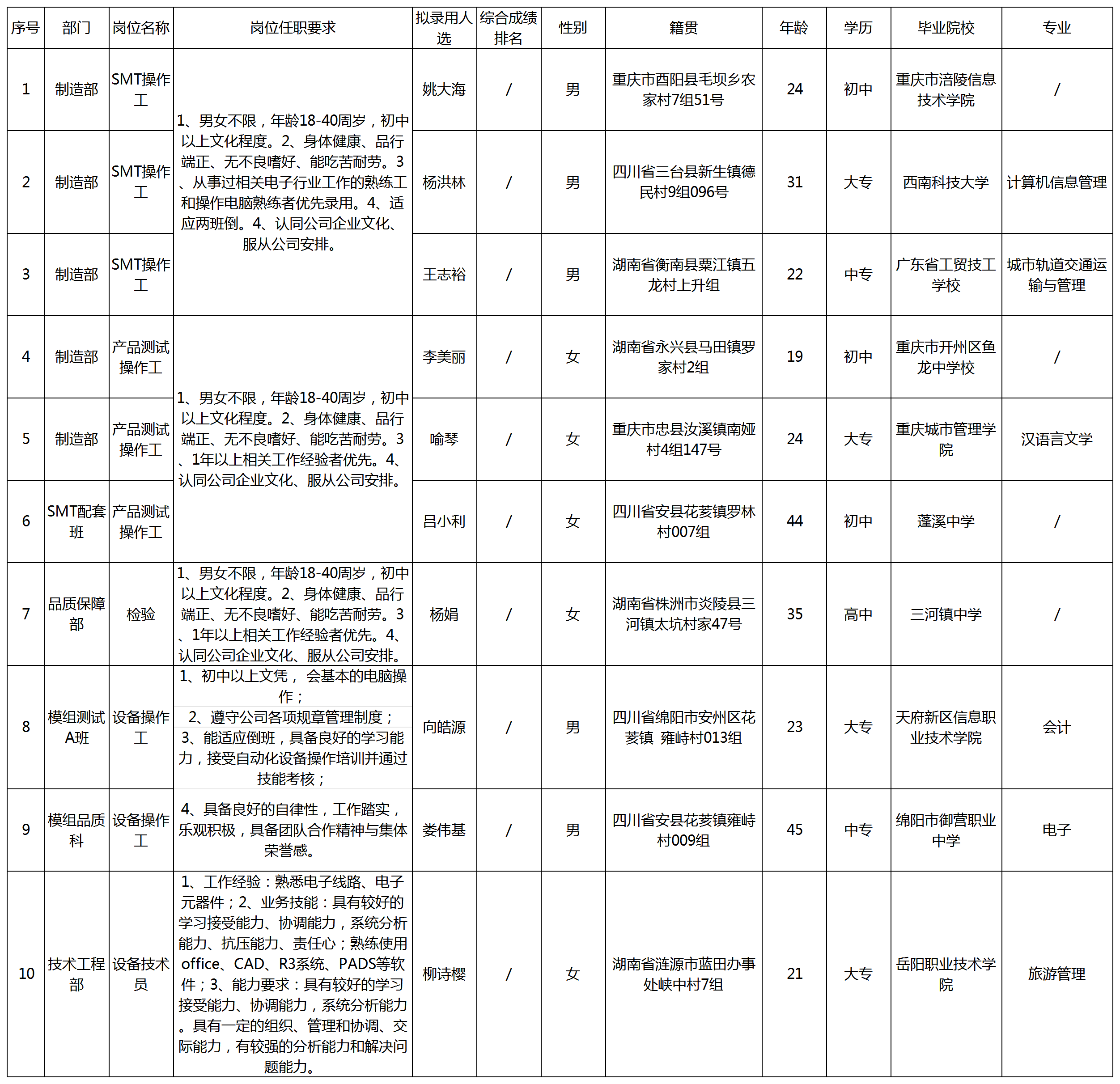 根據(jù)四川愛聯(lián)科技股份有限公司發(fā)布的招聘公告及招聘相關規(guī)定,經面試、考察、體檢等程序,擬錄用以下10人分別到制造中心各個部門工作,現(xiàn)予以公示,具體情況如下: