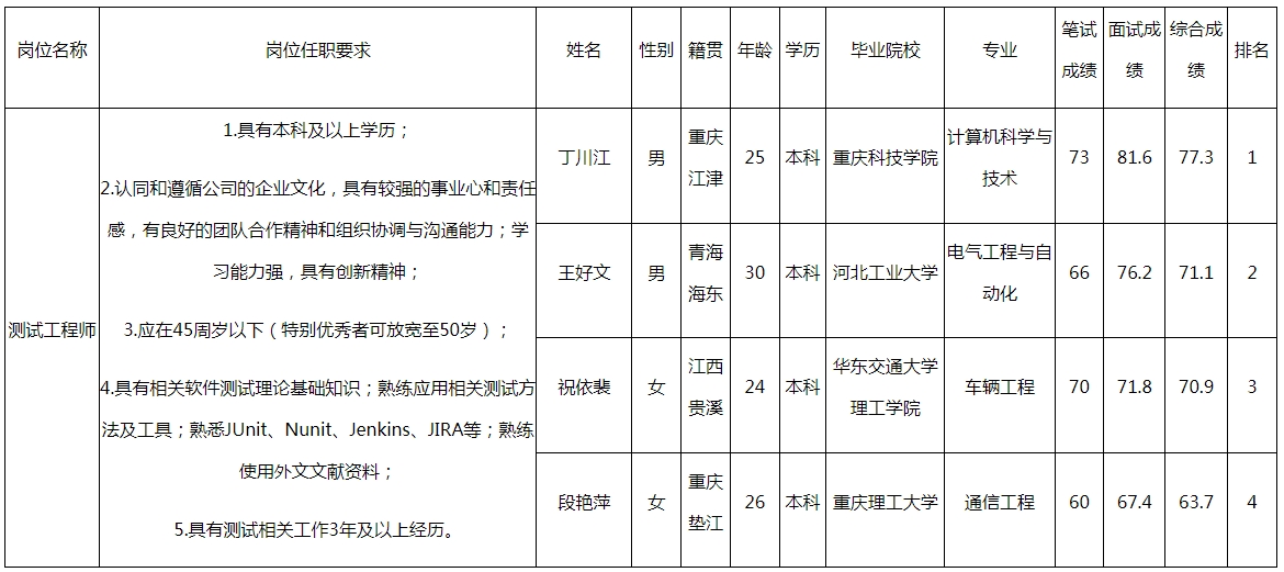 根據(jù)重慶九洲隆瓴科技有限公司發(fā)布的招聘公告及招聘相關(guān)規(guī)定,經(jīng)筆試、面試等程序,現(xiàn)將筆試(面試)成績予以公示。