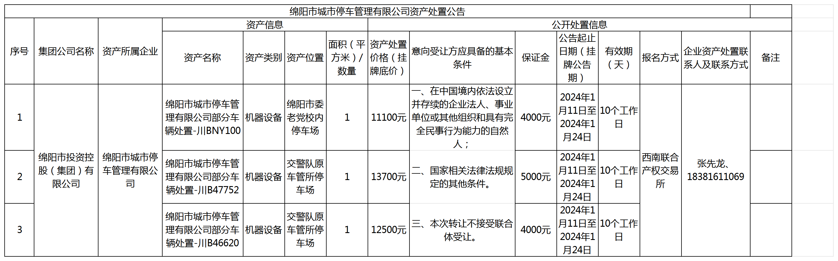 綿陽市城市停車管理有限公司資產(chǎn)處置公告