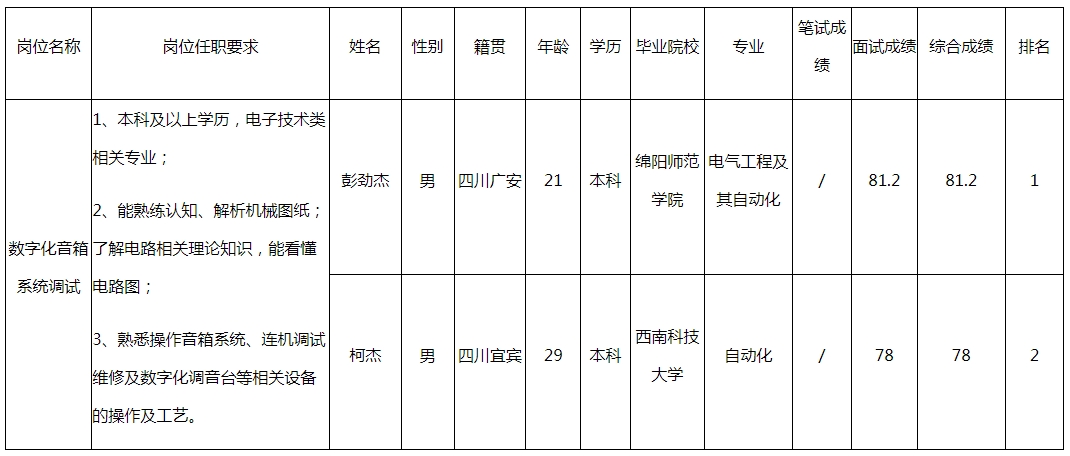 根據(jù)四川湖山電器股份有限公司發(fā)布的招聘公告及招聘相關(guān)規(guī)定,經(jīng)筆試、面試等程序,現(xiàn)將筆試(面試)成績(jī)予以公示。