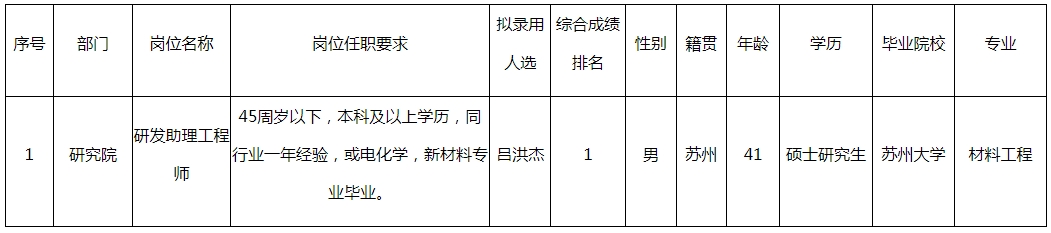 根據(jù)長(zhǎng)虹三杰新能源有限公司發(fā)布的招聘公告及招聘相關(guān)規(guī)定,經(jīng)筆試、面試、考察、體檢等程序,擬錄用呂洪杰同志到研究院工作,現(xiàn)予以公示,具體情況如下: