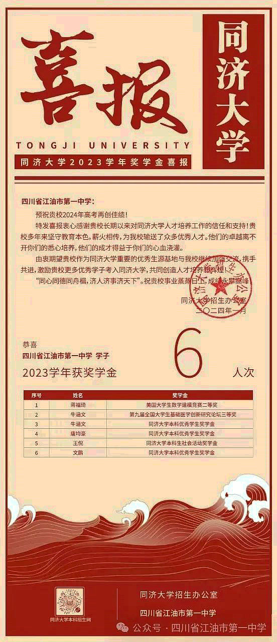 同濟(jì)大學(xué)的喜報(bào)是對(duì)江油一中長(zhǎng)期以來(lái)培養(yǎng)優(yōu)秀拔尖人才所作貢獻(xiàn)的最好印證。江油一中一直秉持“特色發(fā)展、多元發(fā)展、全面發(fā)展”的理念,堅(jiān)守教育初心,傳承薪火,不斷為國(guó)家輸送優(yōu)秀學(xué)子。蔣福琦等5名同學(xué)的優(yōu)異表現(xiàn)得到了同濟(jì)大學(xué)的充分肯定。