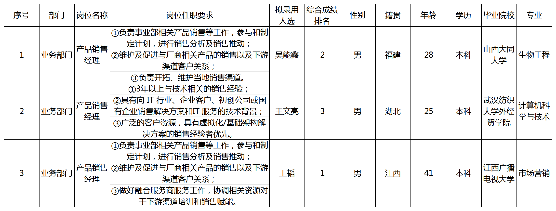 根據四川長虹佳華信息產品有限責任公司發(fā)布的招聘公告及招聘相關規(guī)定,經筆試、面試、考察、體檢等程序,擬錄用吳能鑫、王文亮、王韜同志到四川長虹佳華信息產品有限責任公司工作,現(xiàn)予以公示,具體情況如下: