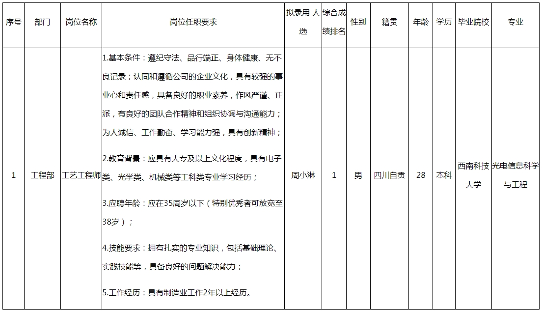 根據(jù)四川九華光子通信技術(shù)有限公司發(fā)布的招聘公告及招聘相關(guān)規(guī)定,經(jīng)面試、考察、體檢等程序,擬錄用周小淋同志到四川九華光子通信技術(shù)有限公司工作,現(xiàn)予以公示,具體情況如下: