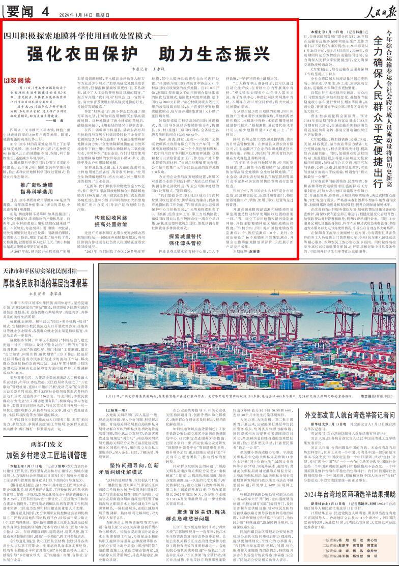 今天(1月14日)出版的《人民日報(bào)》刊發(fā)《四川積極探索地膜科學(xué)使用回收處置模式——強(qiáng)化農(nóng)田保護(hù) 助力生態(tài)振興》的文章,聚焦四川加強(qiáng)農(nóng)業(yè)廢棄物資源化利用和廢舊農(nóng)膜分類處置,同時對綿陽等地推廣新型地膜、探索減量替代等措施進(jìn)行了報(bào)道。全文如下: