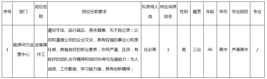 根據(jù)四川長虹電器股份有限公司發(fā)布的招聘公告及招聘相關(guān)規(guī)定,經(jīng)筆試、面試、考察、體檢等程序,擬錄用任必燕同志到能源動力運營中心工作,現(xiàn)予以公示,具體情況如下: