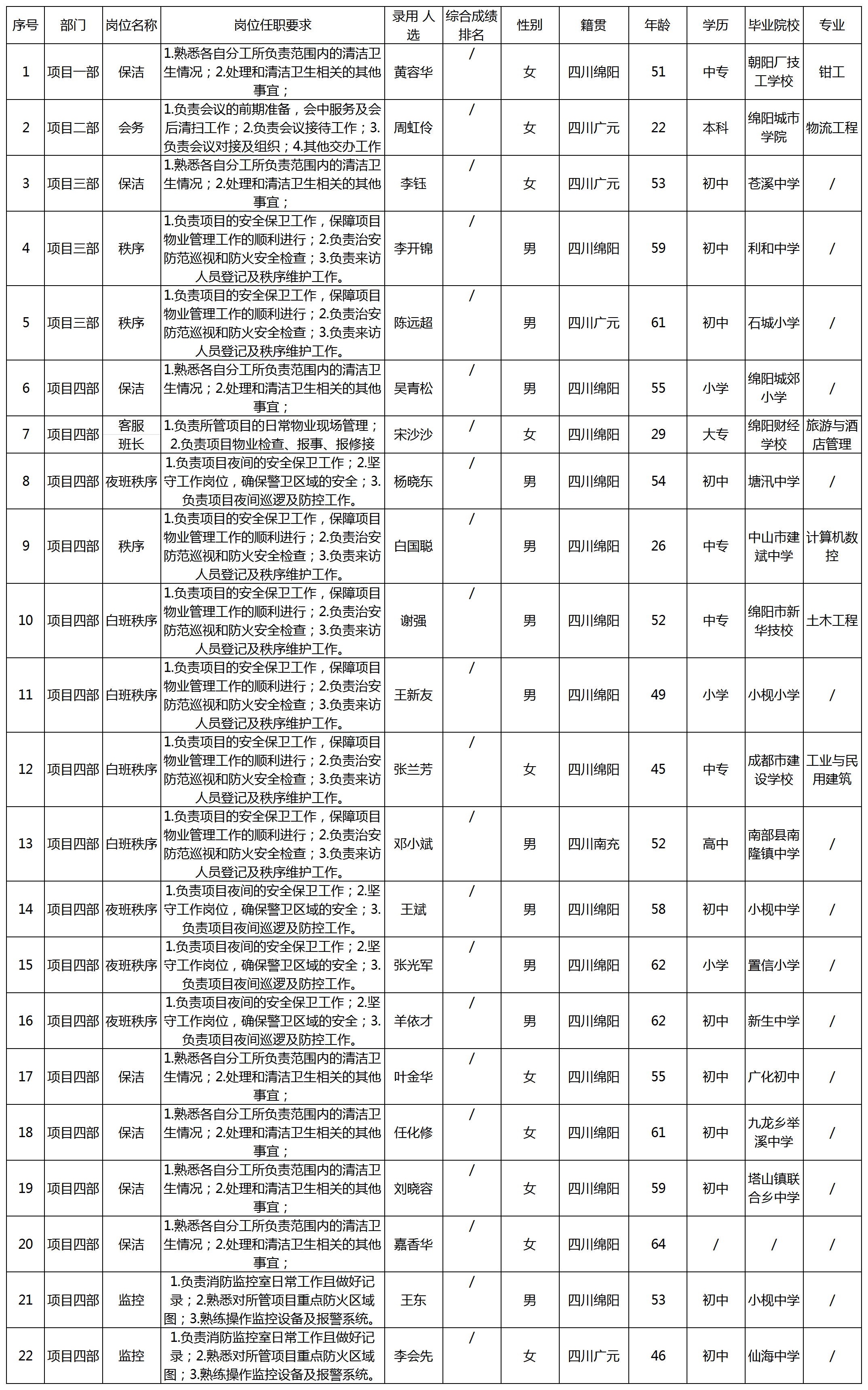 根據綿陽市康來物業(yè)服務有限公司發(fā)布的招聘公告及招聘相關規(guī)定,經面試、試用等程序,錄用以下人員到綿陽市康來物業(yè)服務有限公司各項目部工作,現(xiàn)予以公示,具體情況如下: