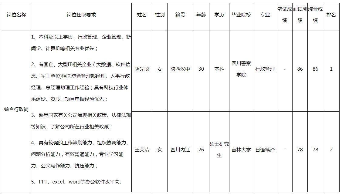 根據(jù)四川九洲軟件有限公司發(fā)布的招聘公告及招聘相關(guān)規(guī)定,經(jīng)筆試、面試等程序,現(xiàn)將筆試(面試)成績予以公示。